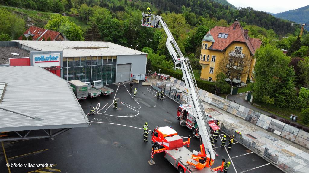 Am Freitag, 03.05.2024 führte die Feuerwehr Landskron unter der Leitung von OBR Patrick Unterrieder eine anspruchsvolle Einsatzübung bei der Hagebau Mössler GmbH durch. Die Annahme war ein Brand in einer Holzlagerhalle mit zwei vermissten Personen.