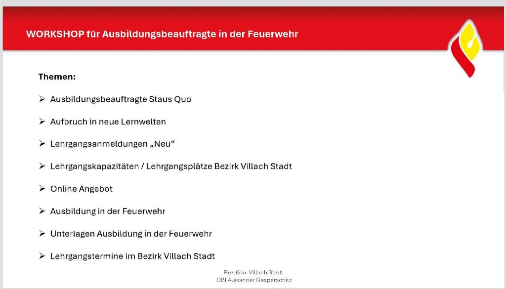 Am Dienstag fand ein informativer Workshop für Ausbildungsbeauftragte der Feuerwehren im Bezirk Villach Stadt statt. Ziel des Workshops war es, den aktuellen Status Quo der Ausbildungsbeauftragten zu beleuchten und neue Perspektiven für die Ausbildung in der Feuerwehr vorzustellen.