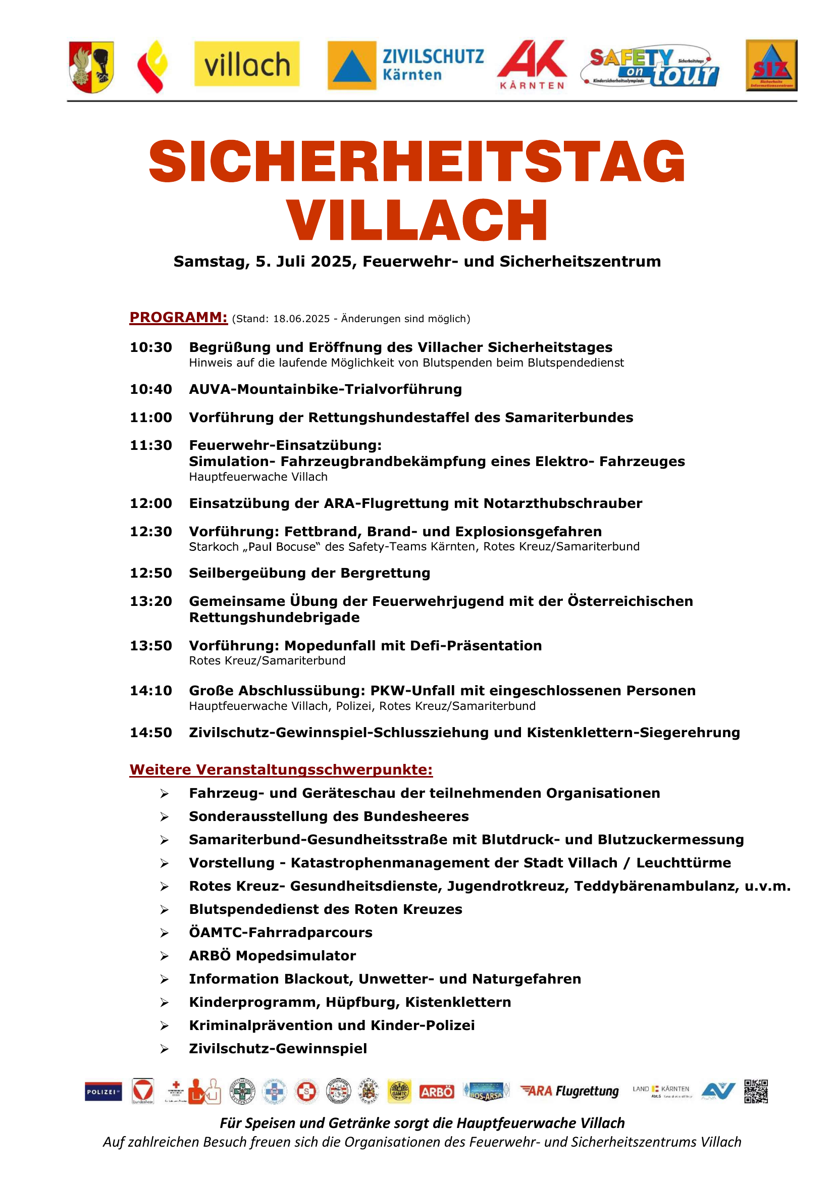 Am Samstag, dem 5. Juli 2025 findet in der Zeit von 10:00 bis 15:00 Uhr im Feuerwehr- und Sicherheitszentrum in Villach ein großangelegter Sicherheitstag statt, der von der Stadt Villach gemeinsam mit dem Kärntner Zivilschutzverband und den Einsatz- und Rettungsorganisationen durchgeführt wird.