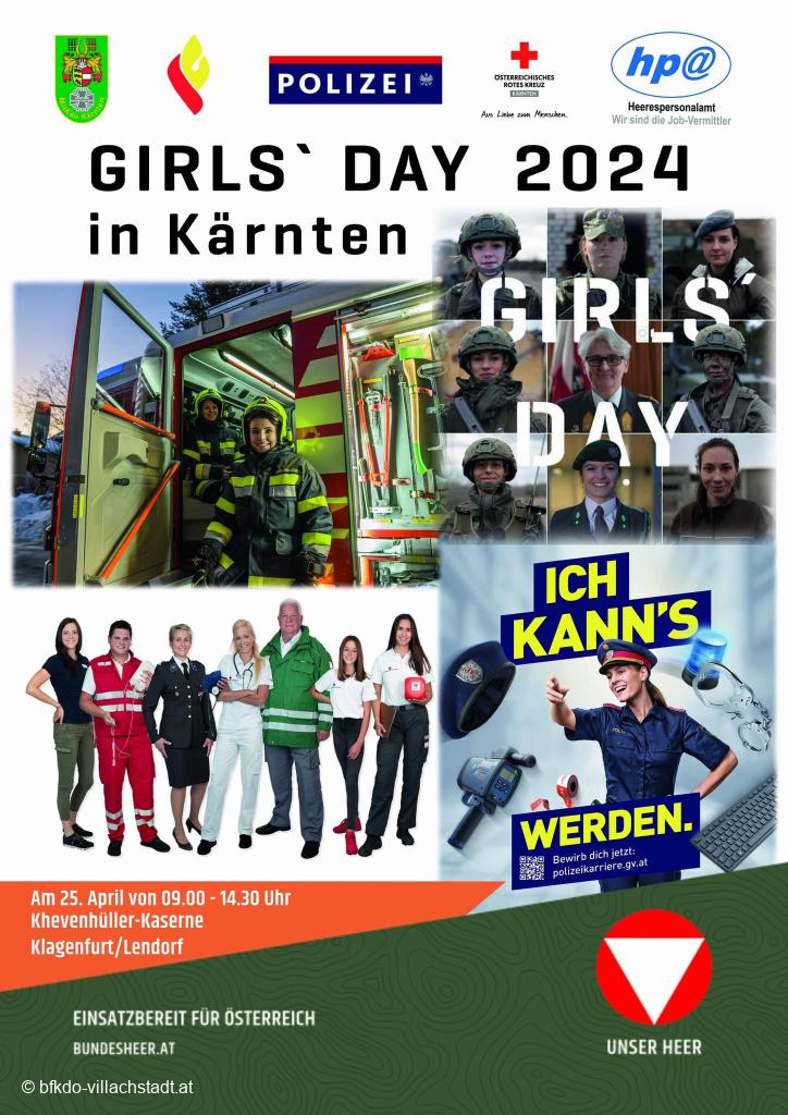 Am 25.04.2024 fand der Girls‘Day in der Khevenhüller-Kaserne in Klagenfurt/WS-Lendorf statt. Trotz des nicht ganz optimalen Wetters nahmen knapp 600 junge Mädchen und Frauen die Gelegenheit wahr, einen Einblick in die Aufgaben der Einsatzorganisationen wie Polizei, Rotes Kreuz, Samariterbund, Feuerwehr und des Bundesheeres zu erhalten.